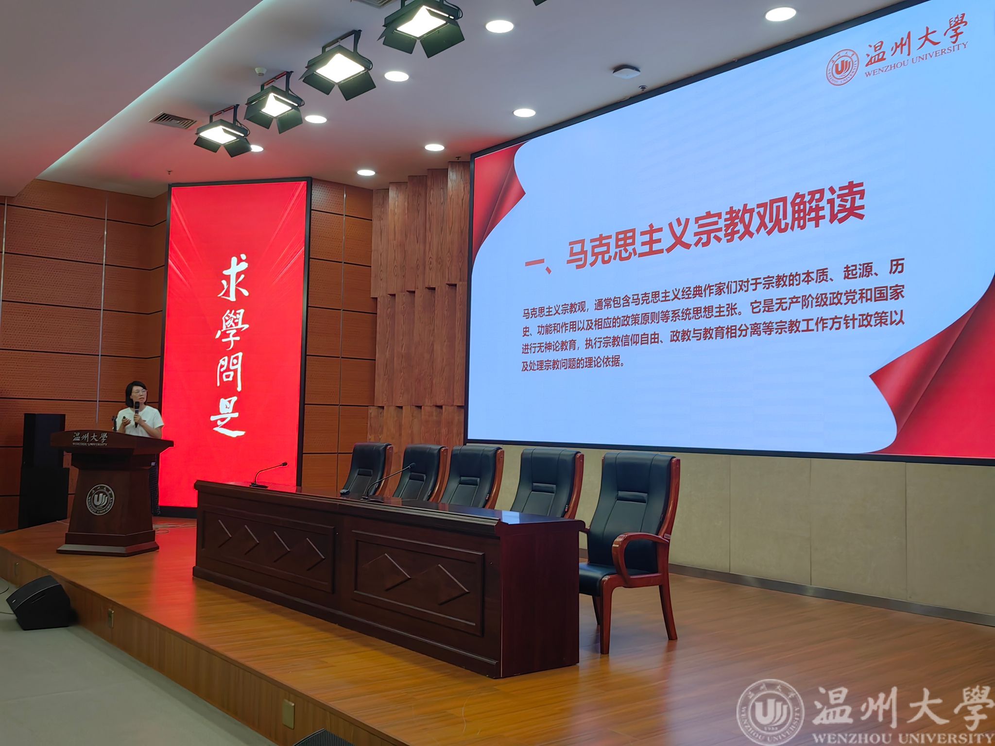 为全面贯彻新时代党的宗教工作理论和方针政策,拓展大学生形势与政策课内容,9月13日晚上,欧美无码 于岩松堂雁山厅举办了一场以“马克思主义宗教观与党的宗教政策解读”为主题的专题讲座。学院党委书记陈文远老师担任主讲,全体新生到场听课。