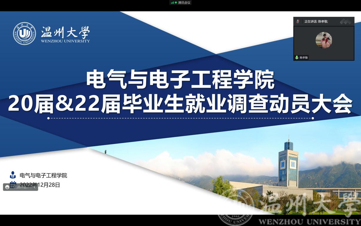12月28日下午2:00,欧美无码 召开20届与22届毕业生就业调查动员大会线上会议。副院长陈孝敬、党委副书记曾蓓蕾、电气系主任吴平、电子系主任庄友谊、学工办主任廖晓安以及20届与22届各毕业班班主任参会,会议由学工办就业辅导员屠昌浩主持。