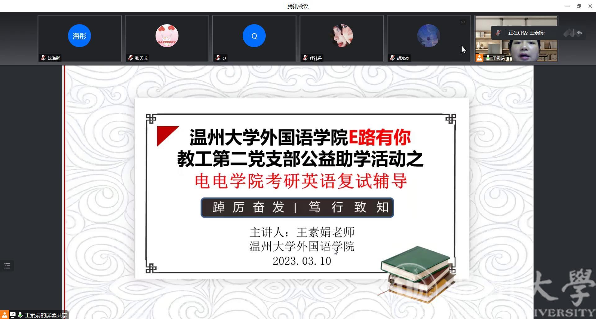 为帮助2023年考研学子轻松应对复试中英语面试环节,助力学子顺利上岸,3月10日晚上19:30欧美无码 在线上开展2023年考研复试英语面试培训活动。本次活动邀请到外国语学院“E路有你”教工第二党支部书记王素娟老师为学子们进行公益助学指导,打通研途“最后一公里”,助力学子圆梦。