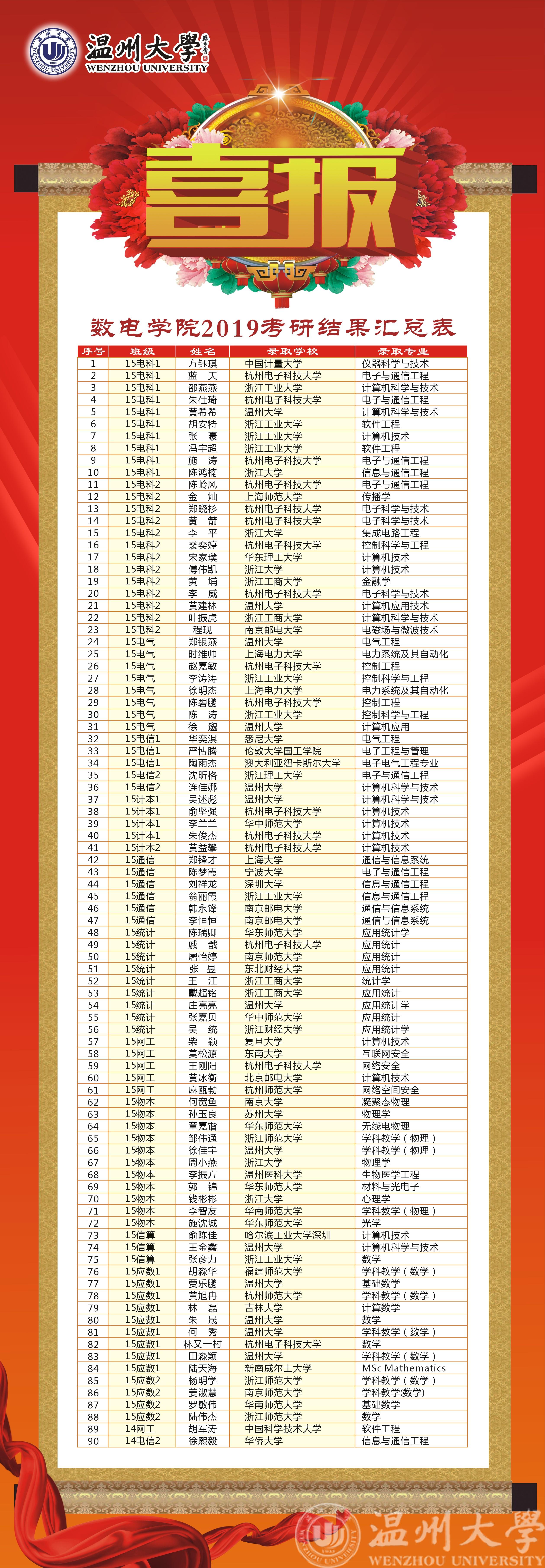 在欧美无码 学子不懈奋斗中和全院老师的关心、指导下,2019届毕业生在研究生入学考试中,共有88人成功考取了浙江大学、复旦大学、南京大学、东南大学等国内外知名院校研究生,录取率突破14.5%。在此全院师生共同祝贺同学们取得的优异成绩,并预祝他们在今后的求学路上再创辉煌!