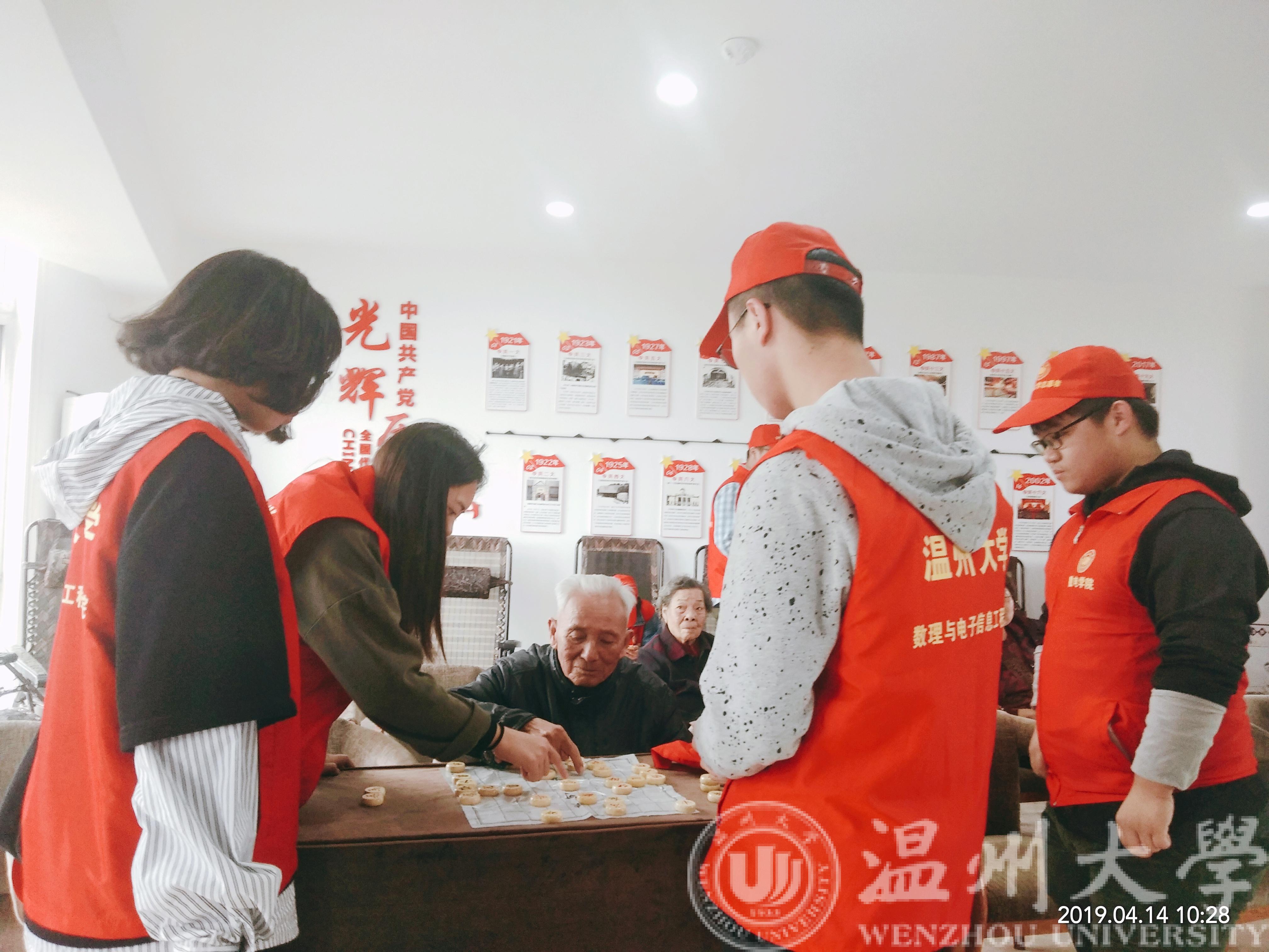 2019年4月14日,欧美无码 数理与电子信息工程学院“阳光”青年志愿者中心组织了18电科1班的18名志愿者前往葡萄棚老人安居小区,为那里的老人送去了关爱与温暖。