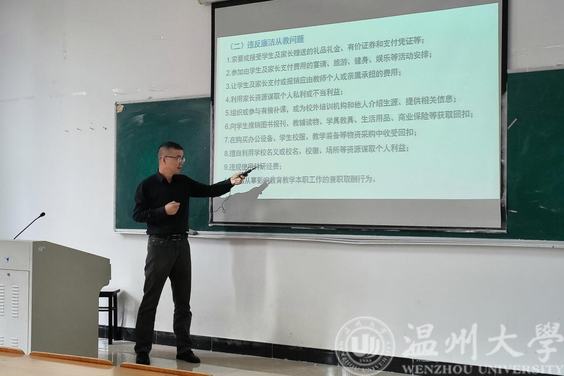 此外,全体教职工对师德师风专项整治工作文件进行了学习,明确了争做有理想信念、有道德情操、有扎实学识、有仁爱之心以及对党忠诚、情操高尚、业务精湛、师者仁心、爱岗敬业、清廉从教的“四有”“六模范”教师的目标。党委书记李方强还就文件中有关师德师风建设的7个方面、35个问题的整治重点进行了阐释,他表示,学院会一如既往地贯彻落实“思想高度重视,政治底线守住;环境无形熏陶,教育常抓有序”的师德师风建设工作思路以及“开学、入职第一讲,日常会议经常谈;书记谈话碎碎念,榜样引领不可少”的师德师风教育模式,积极打造政治素质过硬、业务能力精湛、育人水平高超的高素质教师队伍。文件、会议精神学习之后,还通报了六大类各一个高校领域违规违纪典型案例。同时,全体教工现成签订了师德师风承诺书。