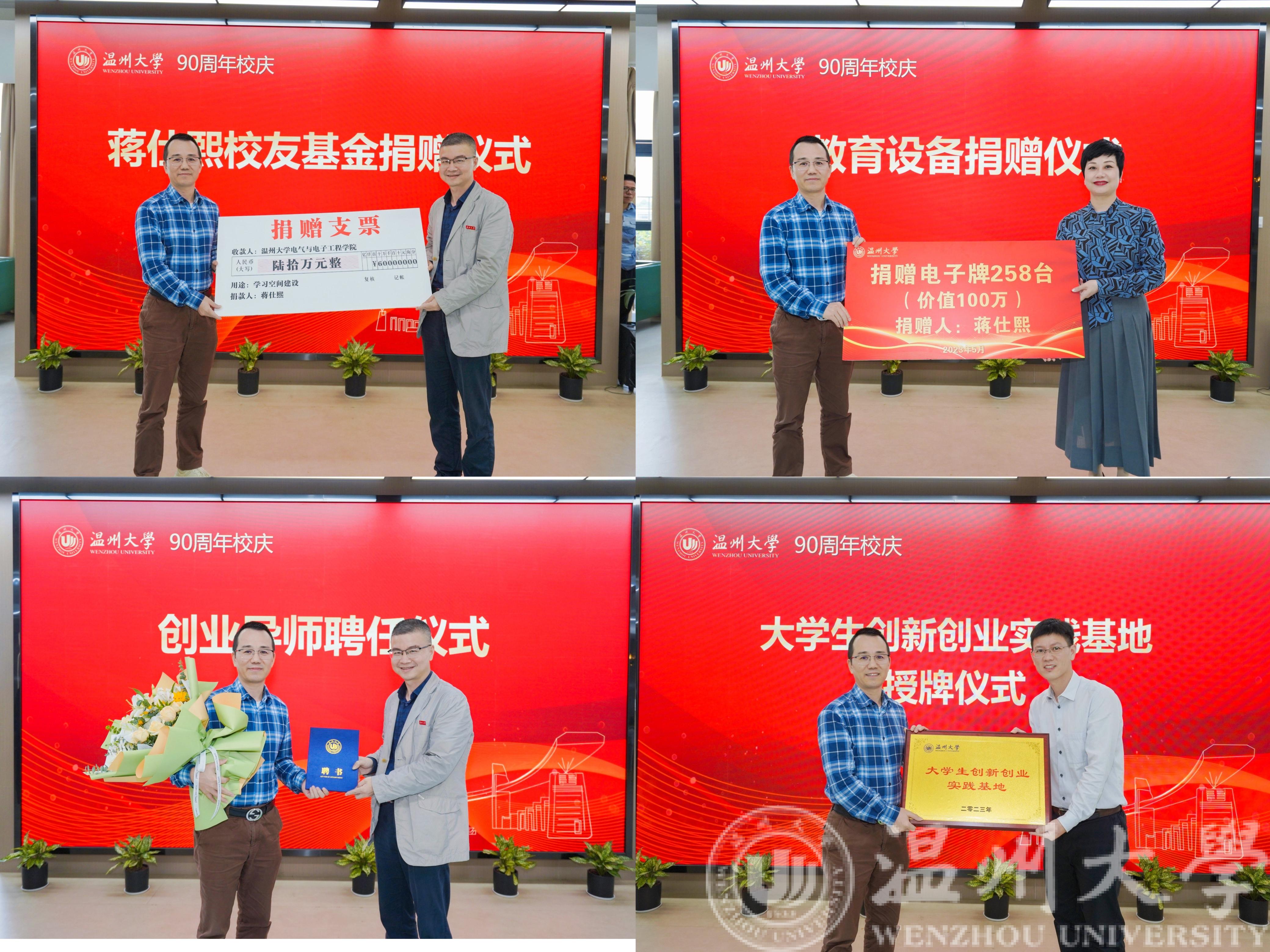 在现场各位嘉宾的共同见证下,蒋仕熙校友与李方强书记和张若妤处长进行了隆重的基金捐赠与教育设备捐赠仪式。与此同时,欧美无码 还聘请蒋仕熙校友担任我校创业导师,并授予蒋仕熙校友的企业为我校大学生创新创业实践基地。