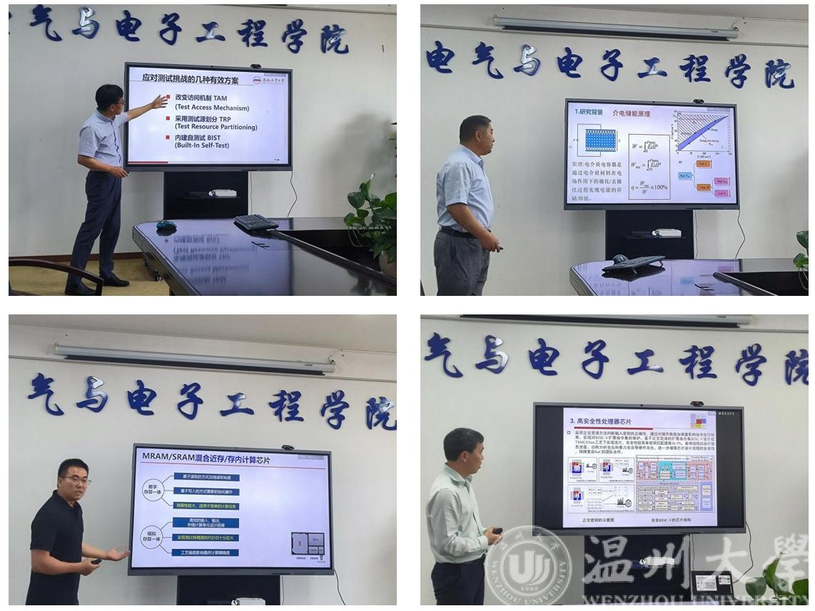合肥工业大学梁华国教授、安徽大学汪春昌教授、北京航空航天大学康旺教授和宁波大学张跃军教授分别就集成电路先进测试技术、超高储能密度电容器、感知端存算一体芯片和低功耗与安全芯片IP核等前沿研究做了精彩的报告。