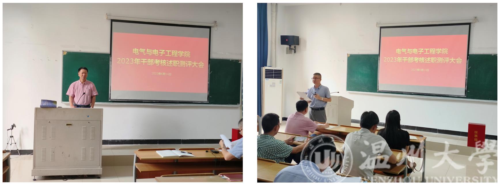 首先举行了2023年干部考核述职测评大会,组织部党委工作人员全程监督。院长汪鹏君与党委书记李方强围绕着“述德”、“述廉”、“述法”及“述绩”进行了现场述职。院长汪鹏君就过去一年取得的累累硕果进行了盘点,着重强调了学院在人才培养、学科科研、服务地方、党的建设以及师德师风建设方面的突出成果。他表示,学院的各项工作要始终紧扣主题主线,围绕学院核心目标,全院上下要精诚团结、踔厉奋发,不断开拓进取、勇于创新、力争突破,扎实推进学院高质量发展。党委书记李方强从党建融合业务、廉政建设与师德师风建设等方面作述职汇报。他强调,全院上下要在思想上、政治上、行动上,始终同以习近平同志为核心的党中央保持高度一致,持续锤炼党性修养,保持廉洁自律的工作作风,筑牢师德师风的篱墙,努力推动学院各项工作再上新台阶。随后在组织部党委工作人员的监督下,有序进行了群众测评环节。