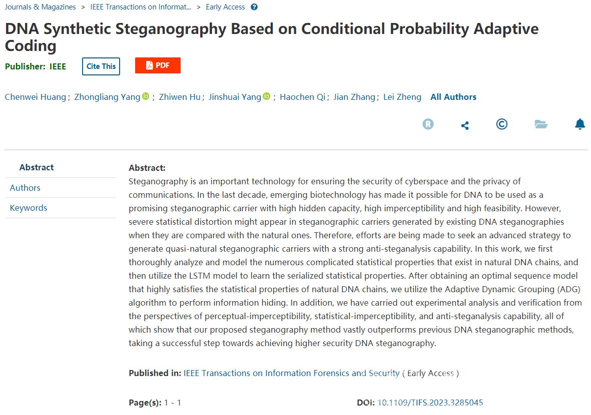 针对目前DNA隐写术的统计失真问题,我校欧美无码 张鉴教授课题组与北京邮电大学、合肥工业大学等团队深度合作,提出了一种基于序列建模及条件概率自适应编码的序列生成式DNA隐写术,利用循环神经网络与长短期记忆神经元模型建模并学习原始天然DNA载体中的统计分布特征。获得高保真序列模型后,通过自适应动态分组算法生成与天然DNA载体高度相似的隐写载体。重复的抗隐写分析实验表明所生成的DNA隐写载体显著提升了抗隐写分析能力,可有效抵抗来自最先进神经网络隐写分析术的侦测。同时,课题组还针对统计-不可感知性提出了两种全新的评价方法,建立了DNA隐写中不可感知性的统一评价体系。