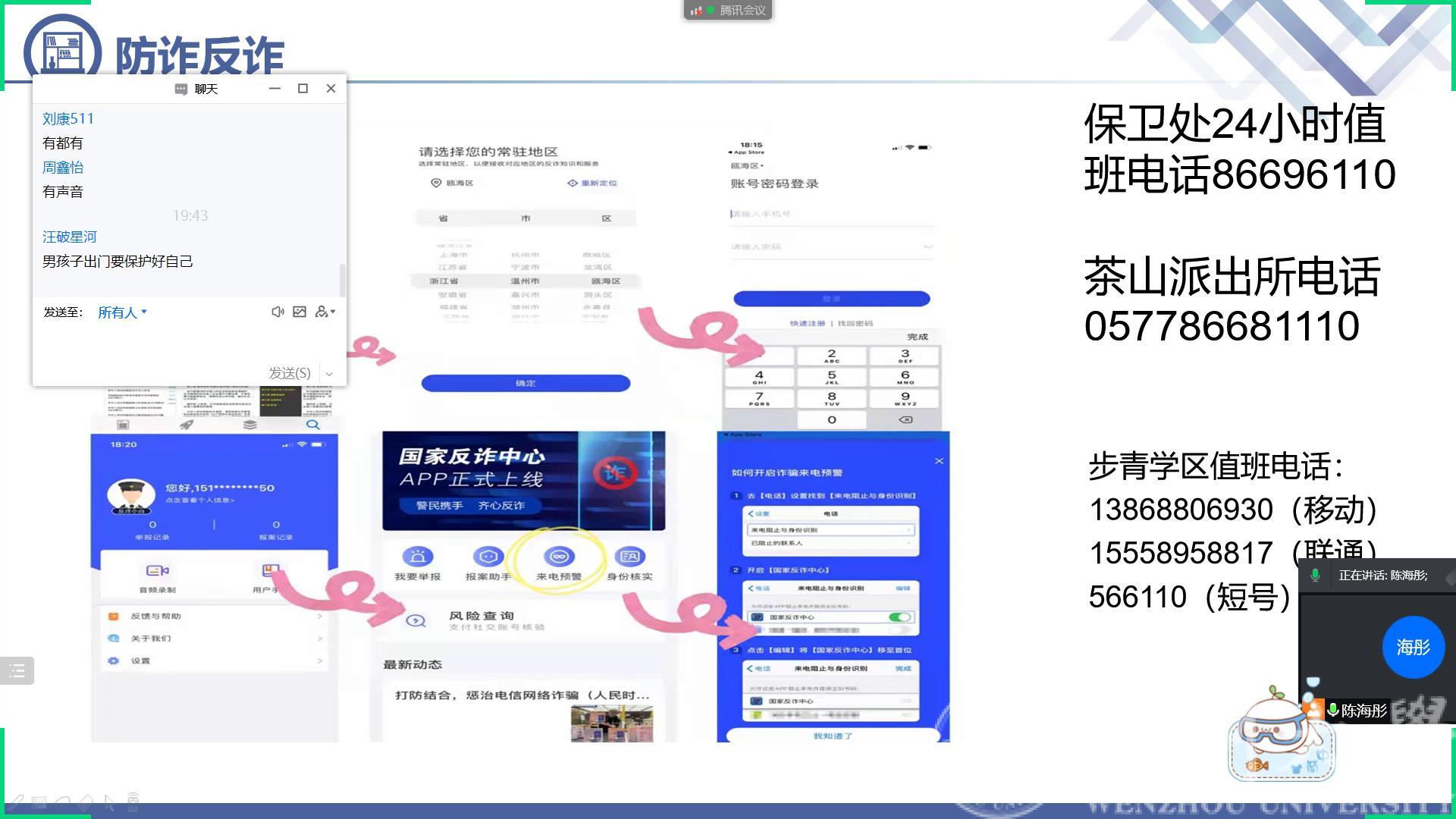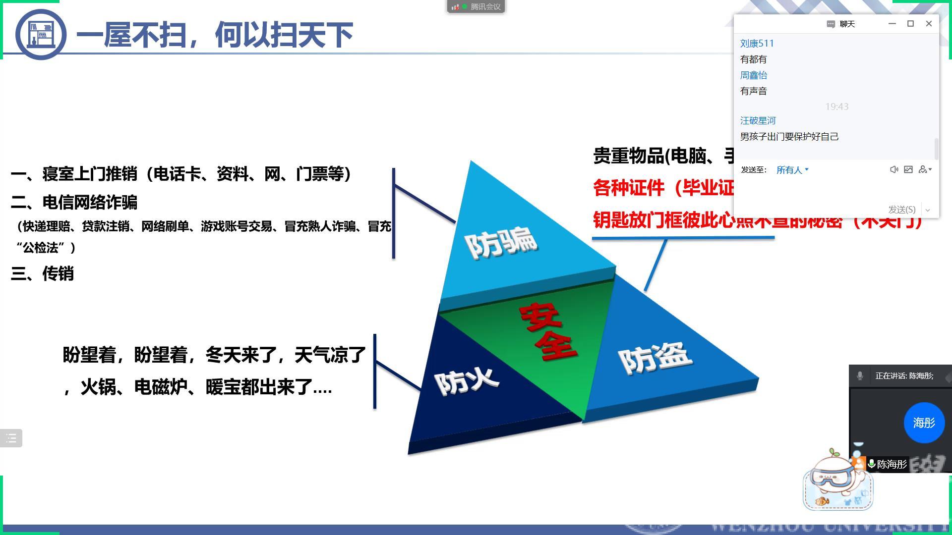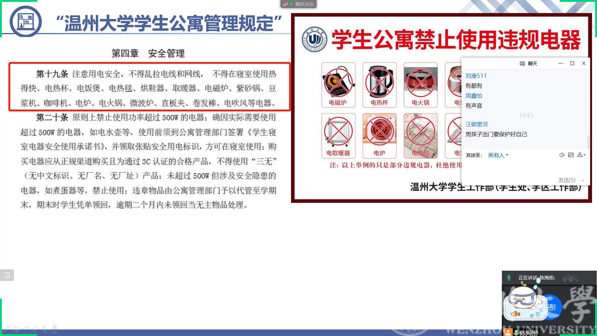 2月21日晚上19:30,欧美无码 召开全体寝室长线上会议。会上公寓辅导员陈海彤老师从寝室卫生管理、公寓安全管理、防诈反诈、寝室关系、宗教政策以及心理健康方面进行讲解,重点讲解了学校的公寓管理规定。另外陈老师就宿舍人际关系进行讲解,希望同学们能够珍惜在寝室的情谊;同时寝室长要积极参与心理健康相关的培训,关注寝室同学的心理状态以及日常考勤,有情况及时和辅导员反馈。