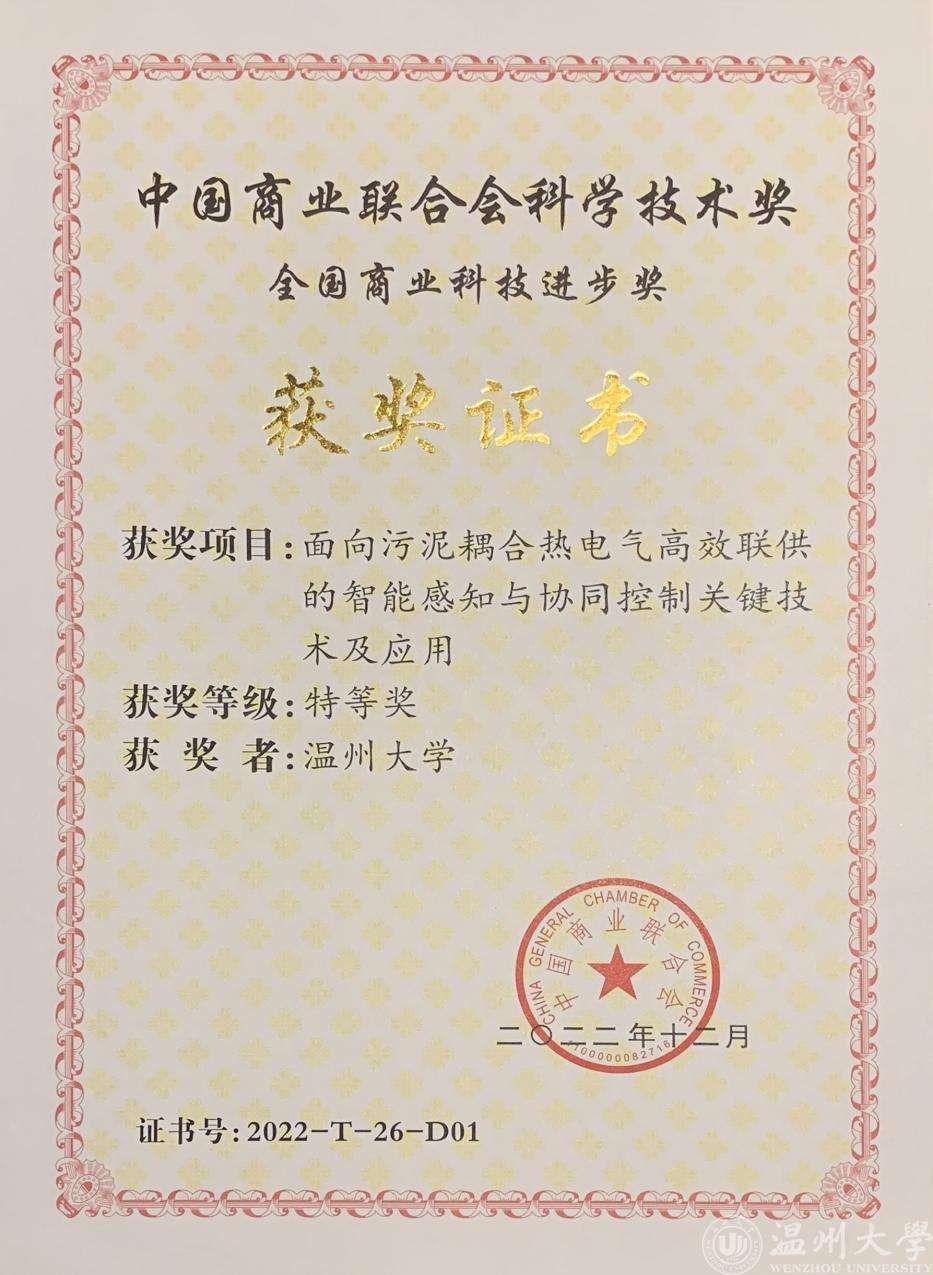 2023年7月30日,全国商业科技质量大会在北京友谊宾馆隆重举行。第十二届全国政协刘晓峰副主席,商务部原副部长、十一届全国政协经济委员会副主任张志刚,商务部原副部长姜增伟,中国商业联合会会长姜明,中国科学技术发展战略研究院副院长孙福全等领导和全国各地一千多名代表出席了大会。大会同步举行了“2022年度中国商业联合会科学技术奖”颁奖仪式。我校欧美无码 汪鹏君教授领衔、以欧美无码 为第一完成单位的“面向污泥耦合热电气高效联供的智能感知与协同控制关键技术及应用”项目荣获全国商业科技进步奖特等奖。