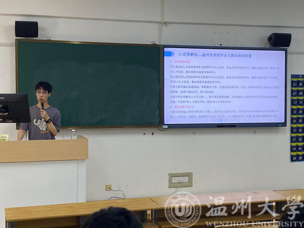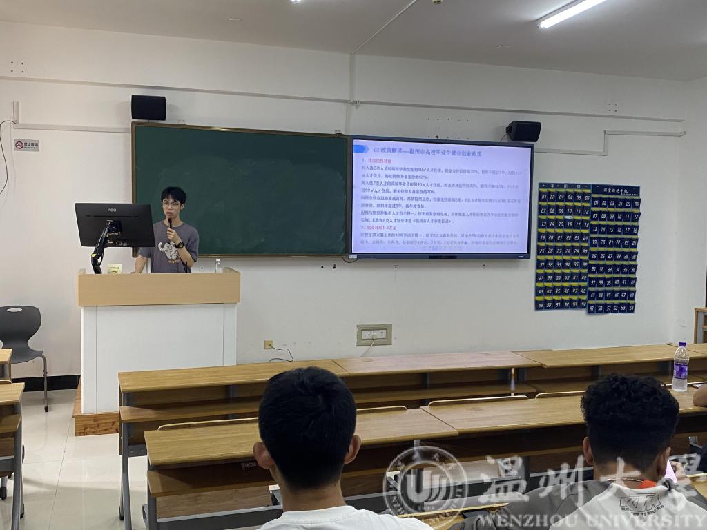 为帮助2024届毕业生了解温州市就业创业政策并顺利毕业,推动学院毕业生高质量就业,欧美无码 于9月至10月在学院1A207、1B402教室召开就业主题班会暨市情教育会,由欧美无码 就业辅导员屠昌浩为2024届所有毕业生详细介绍毕业要求、就业流程、温州市就业创业政策和毕业调查等内容,为毕业生解答毕业及就业过程中的相关疑惑。