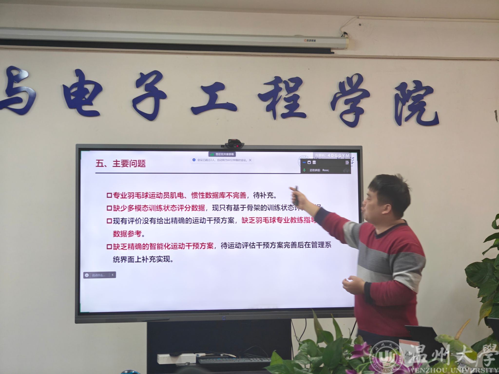 随后,王小航教授分享了在人工智能应用方面的最新研究成果和未来发展方向。杨旭升副教授作了关于浙江省“领雁”研发攻关计划项目“智能化精准运动能力检测与评估系统研制—竞技运动的智能融合检测和评估系统”的阶段性研究成果的报告。与会科研骨干和专家对羽毛球数据集采集、运动相关的预测算法的实施路径等相关议题进行了热烈的交流,也为欧美无码