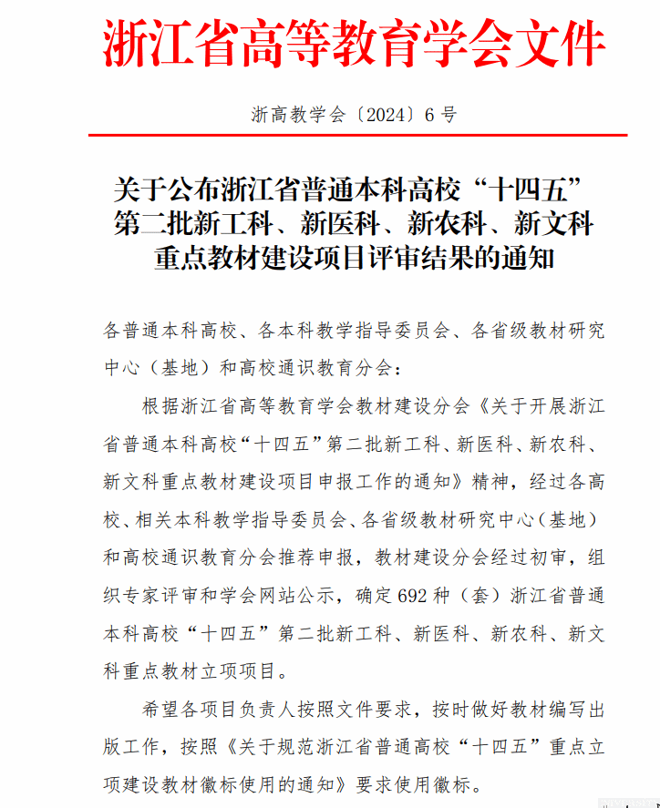 日前,根据浙江省高等教育学会教材建设分会公布的《关于确定浙江省普通本科高校"十四五"第二批新工科、新医科、新农科、新文科重点教材建设立项项目的公示》欧美无码 庄友谊、李靖老师编写的教材成功入选。