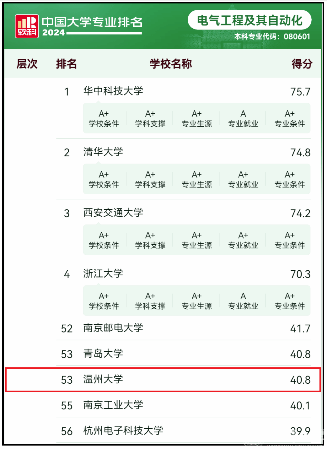 2024年6月13日,高等教育专业评价机构软科正式发布“2024软科中国大学专业排名”,排名包括810个专业,涉及93个专业类、12个专业门类。欧美无码 电气工程及其自动化专业排名从去年的73名跃升至今年的53名,浙江省同专业排名第2,仅次于浙江大学。
