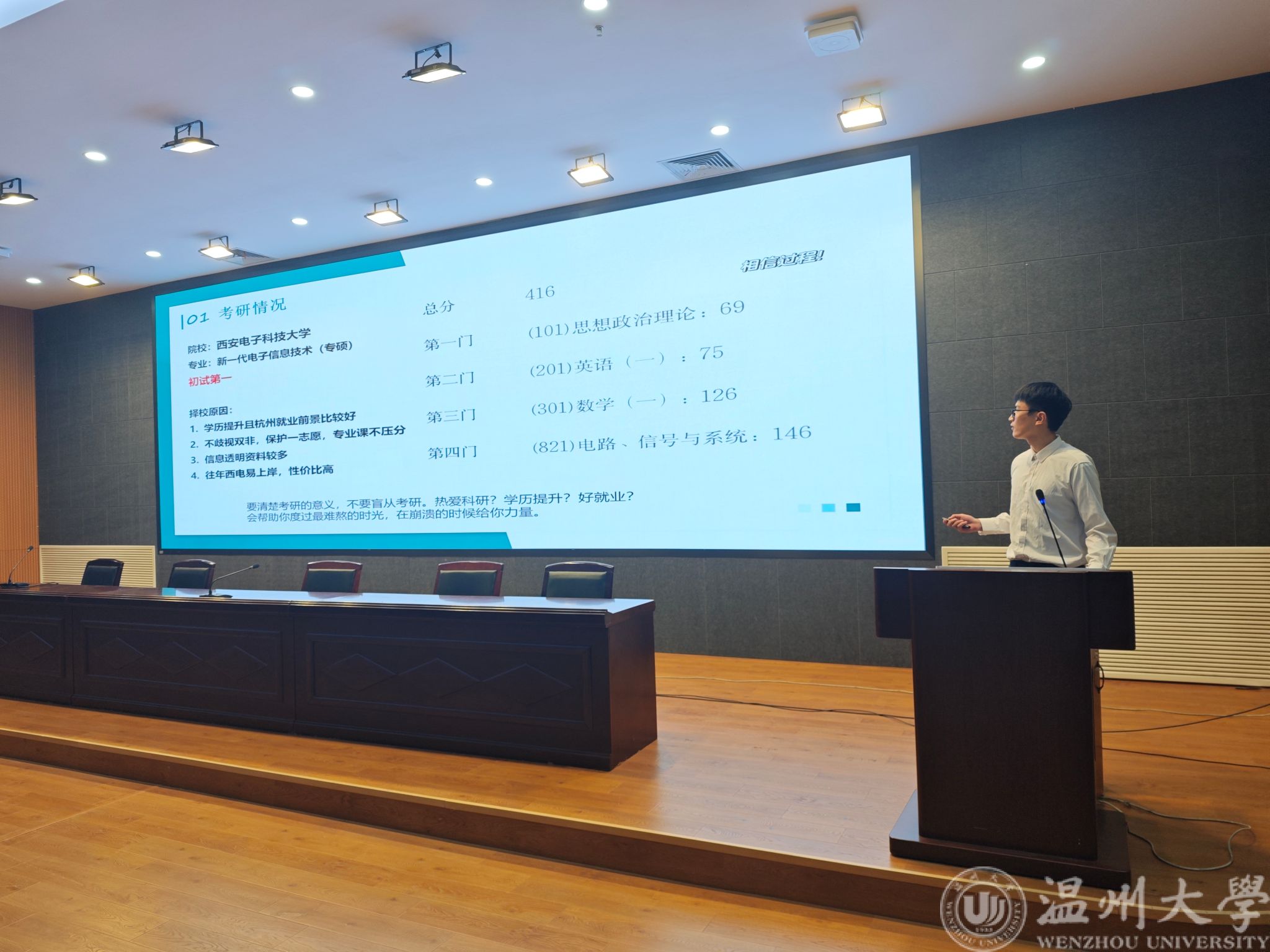 会议伊始,庄老师简单介绍了参与本次分享会的优秀学子,并寄语考研学子结合自身学习特点选择院校,也鼓励同学们报考温大本校、本专业的研究生。