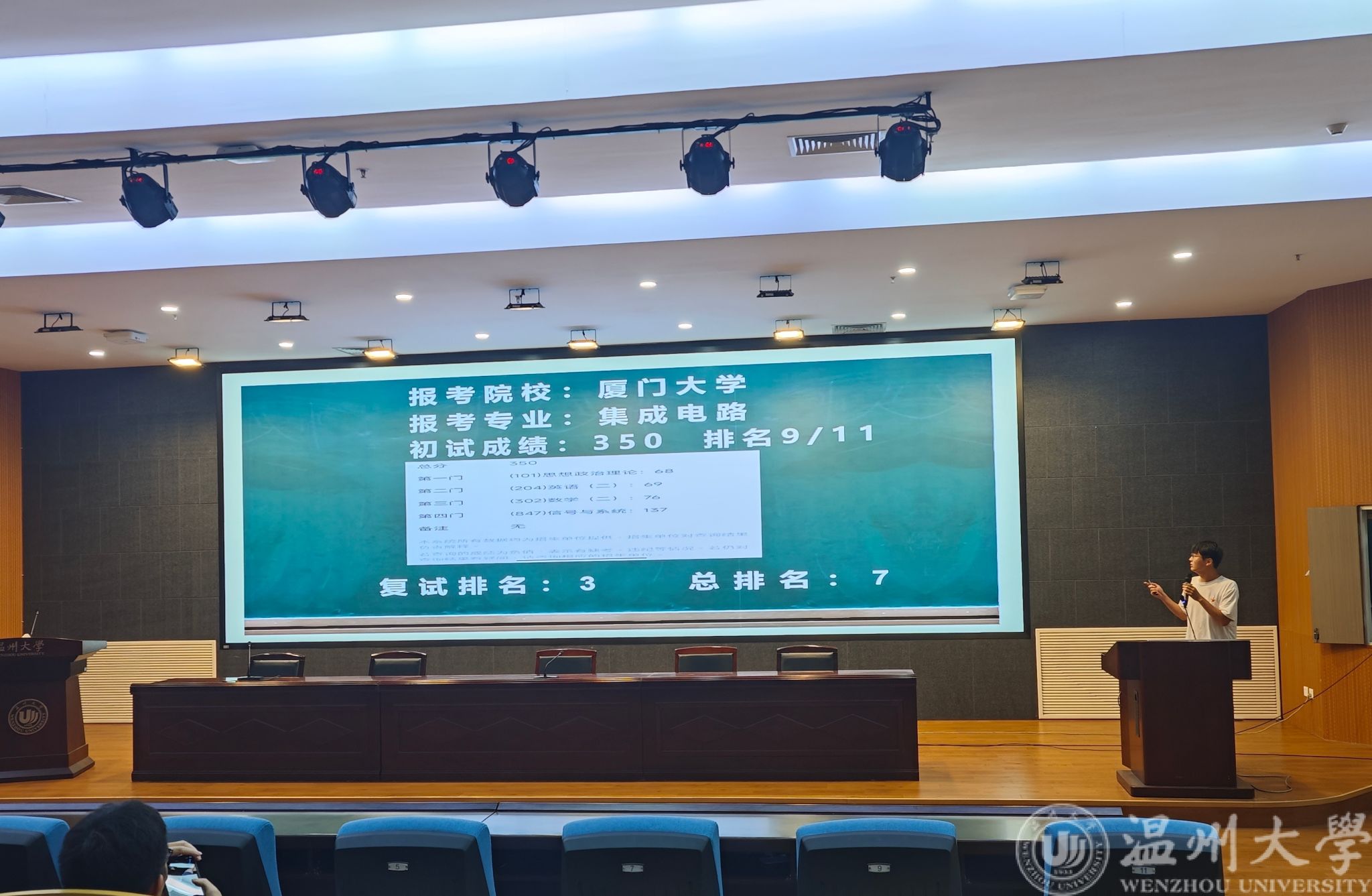 随后,五位同学依次上台发言,从院校选择、时间规划、学习方法、资料推荐、复试经验等多个方面展开。刘镇豪同学结合自身经历,以考研时间轴为线索,细述各科复习要诀与精选资料;刘俊杰同学以实战视角,分享自己备战厦门大学集成电路专业的点点滴滴,警示同学们复试不容小觑;许柯青同学鼓励学弟学妹们结合自身的学习特点和考研复习进展选择适合自己的院校;徐志伟同学在院校抉择与复习规划上,以亲身经历为引,分享宝贵经验;张文沛同学详细介绍了自己申请出国出境留学的酸甜苦辣,为同学们开拓视野,提供多元选择。在场的同学们纷纷表示深受启发。
