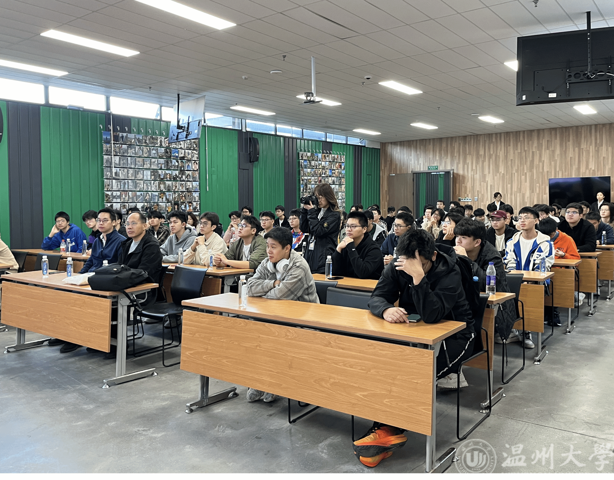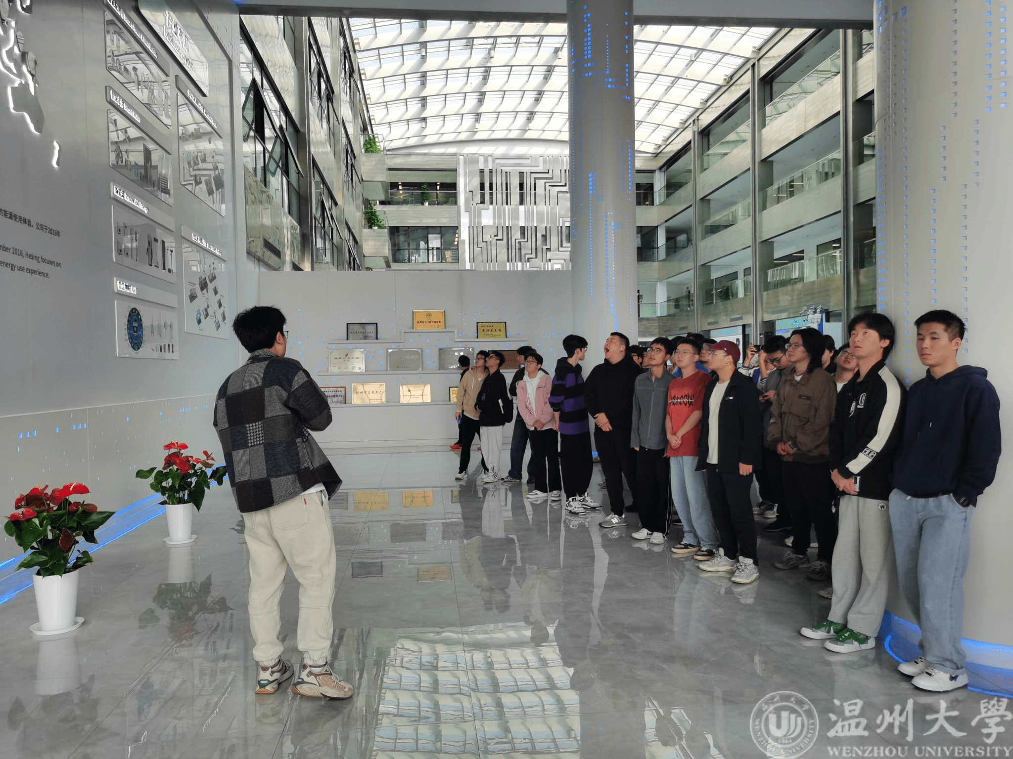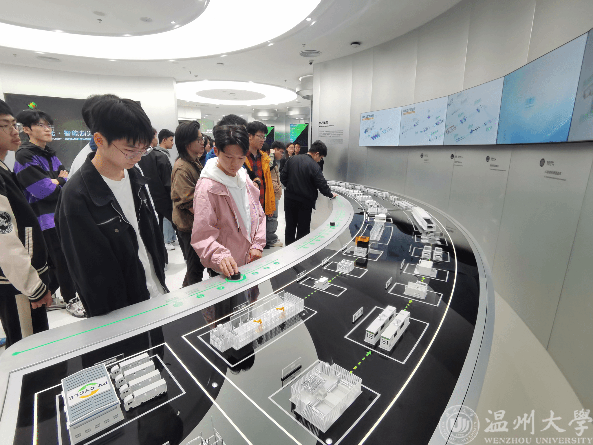11月7日中午,师生一行抵达正泰新能后稍作休整,在工作人员的热情欢迎和细致讲解下,获悉了正泰新能近年来的生产成就,并参观了自动化程度最高的四期太阳光伏板电池厂房和组件厂房。看着一块块墨色光伏电池在流水线上流淌,AGV小车在各段产线上智能有序往返,同学们对新能源应用领域也有了更深的理解。参观完厂房车间,师生们进入正泰新能的技术创新中心。各式精致新奇的模型与视窗无一不透漏出正泰企业对新能源新技术、产品倾注的心血。