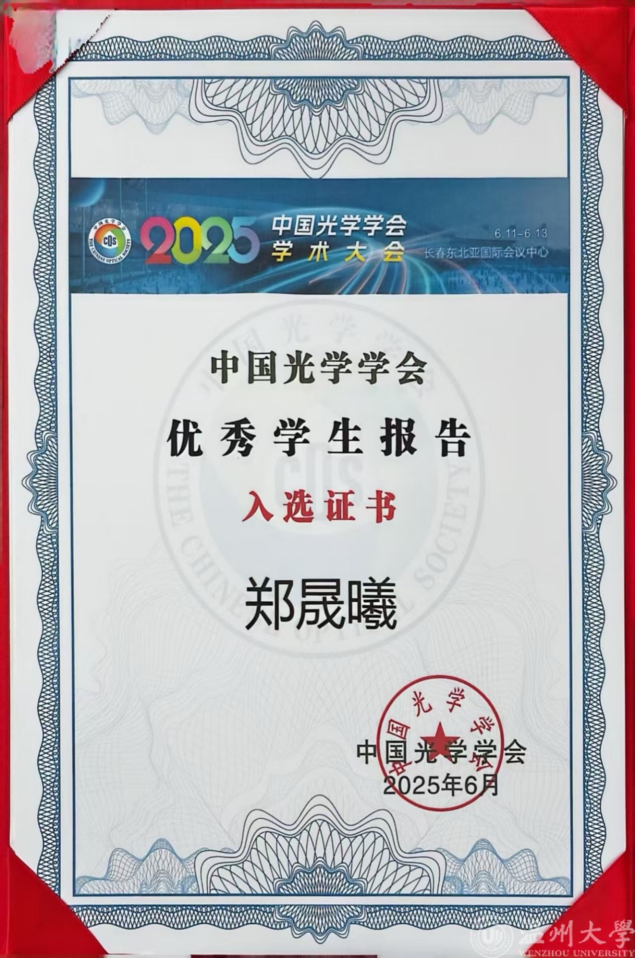 6月11-13日,2025年中国光学学会学术大会在长春东北亚国际会议中心召开。欧美无码 温州市微纳光电重点实验室/浙江省光电功能器件与数字化检测国际合作基地师生参会并在“激光物理技术与应用”专题作学术报告。会议评选了50个中国光学学会“优秀学生报告”,欧美无码 郑晟曦和李松涛等学生的张贴报告《全固态级联拉曼单腔多色激光技术及器件集成》获评中国光学学会“优秀学生报告”,“激光物理技术与应用”专题仅3个(包括口头报告和张贴报告)入选。12日下午在长春东北亚国际博览中心举行了优秀学生报告的颁奖仪式,学会秘书长刘旭教授为获奖者颁奖。