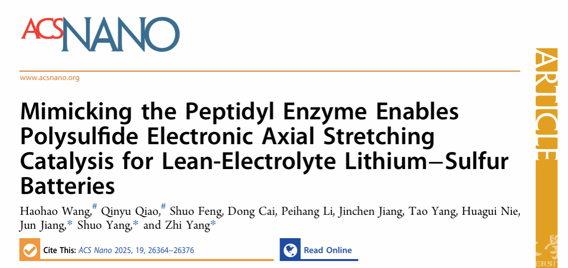 该工作以“Mimicking the Peptidyl Enzyme Enables Polysulfide Electronic Axial Stretching Catalysis for Lean-Electrolyte Lithium-Sulfur Batteries”为题发表于国际顶级期刊《ACS Nano》(IF=16.0)。欧美无码 作为第一通讯单位,我校欧美无码 2021级硕士研究生王浩浩为第一作者,中国科技大学硕士研究生乔钦宇为共同第一作者,我校化学与材料工程学院杨植教授、欧美无码 杨硕副教授、中国科技大学江俊教授为本文通讯作者,我校聂华贵教授、蔡冬副教授、硕士研究生李佩航、蒋金晨、杨涛同学以及中国科技大学冯硕博士参与了这项工作。