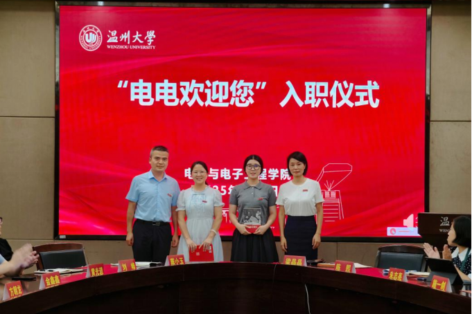会议伊始,学院负责人为两位新入职教职工举行了温馨的“电电欢迎您”入职仪式。学院党委书记、副院长分别为新教师赠送校徽和书籍。
