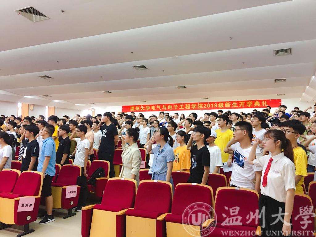 开学典礼在激昂的国歌声中拉开帷幕,典礼第一项,汪鹏君院长致辞。汪院长从学校历史到学院演变,向全体新生详细介绍了学院专业、工程中心、创新团队及实验室情况。同时,汪院长也向新生提出了三个问题——为什么要上大学?学什么?如何学?这其中也蕴含着汪院长对电电学院“第一届”新生的要求——学会自我管理、礼貌与感恩,树立阶段性目标并明确目标。