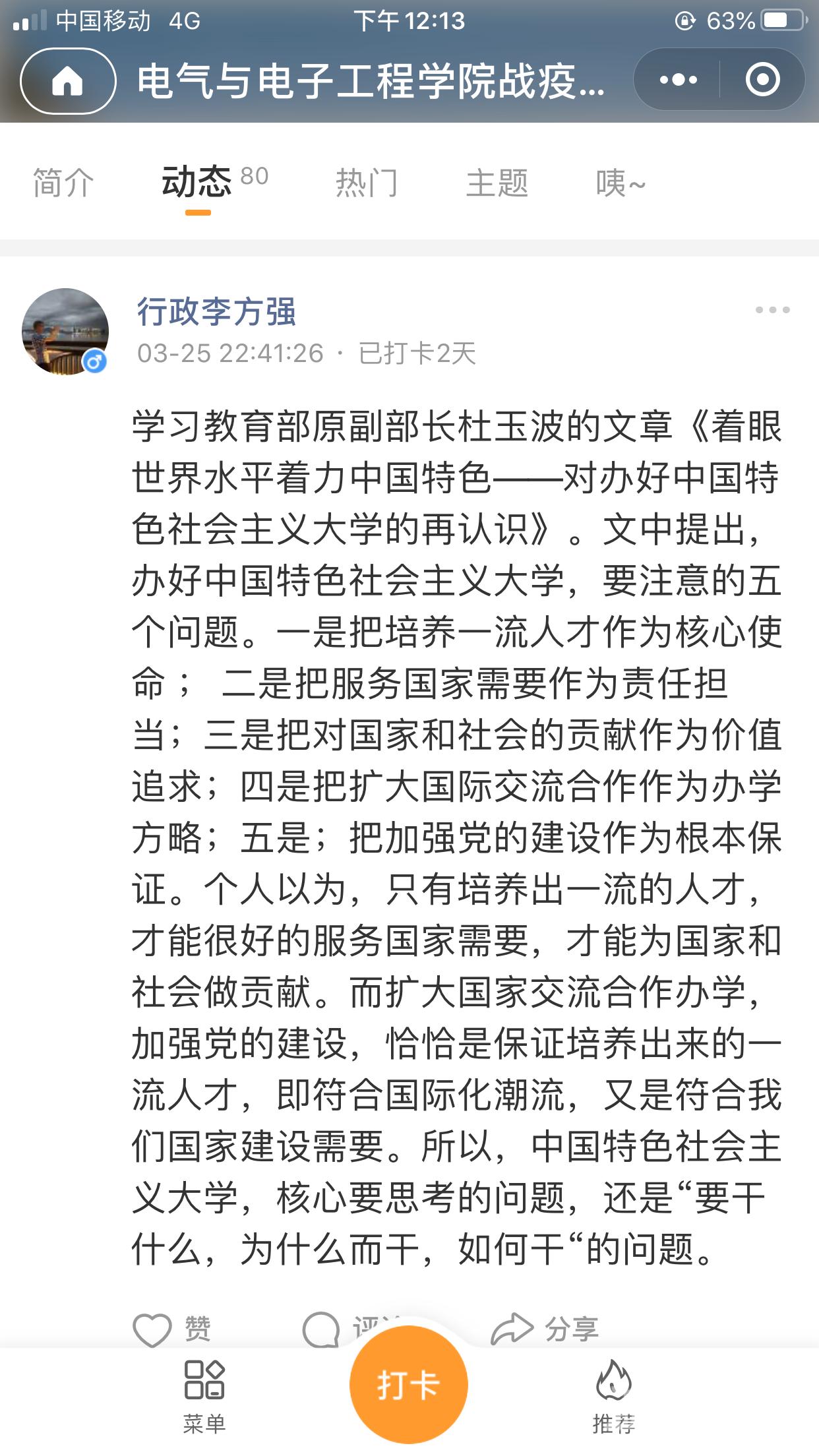 图一:院党支部书记李方强在“小打卡”程序中上传的分享