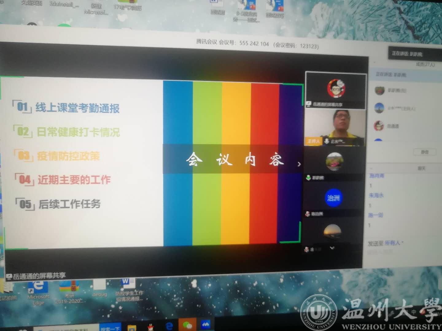 为进一步做好新冠肺炎疫情防控工作,维护开学前后学生身体健康及学校安全,4月17日晚19:00,欧美无码 通过腾讯会议APP召开本学期“期中班主任工作网络主题会议”,此次会议由院党委副书记曾蓓蕾主持,学院全体辅导员、各年级班主任参加了此次会议。
