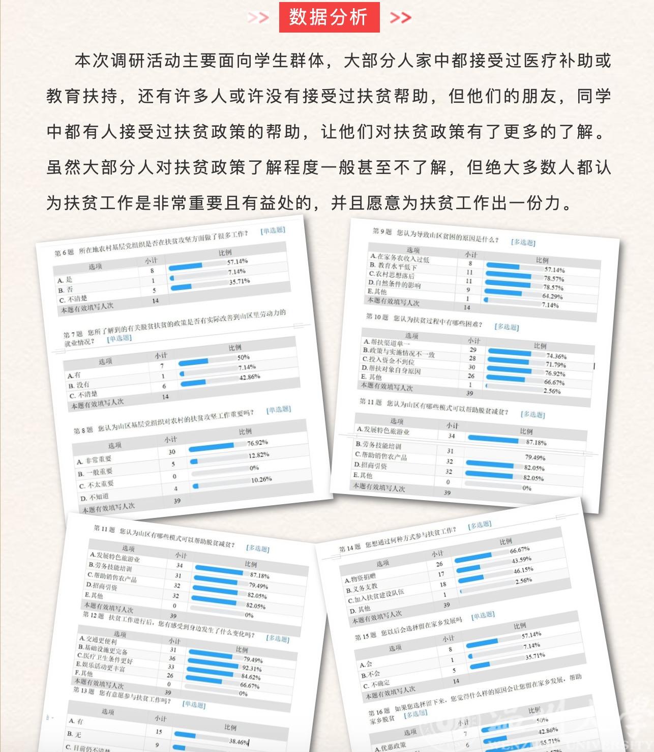 2020年8月8日,欧美无码 第一届“益行”暑期社会实践队关于山区扶贫线上调研活动圆满完成。为引导人们关注贫困问题、关爱贫困人口、关心扶贫工作,营造“人人皆愿为”的社会扶贫氛围,弘扬“人人皆可为”的公众扶贫理念,体验“人人皆能为”的参与扶贫机制,也为了“益行”暑期实践队后续活动更好的展开,实践队线上全体成员开展了关于山区扶贫的线上调研活动,旨在通过线上调研活动,分析人们对于扶贫工作的了解程度,让更多的人关注扶贫工作,参与扶贫工作中来。