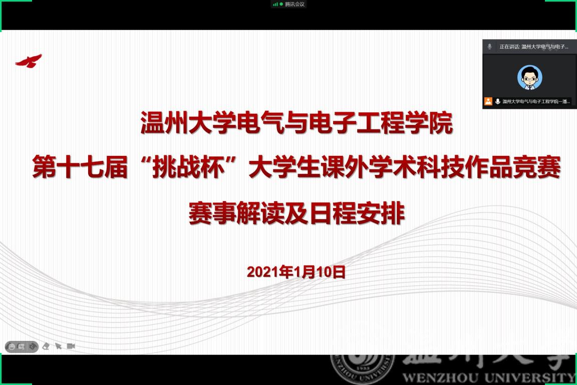 为及时传达1月8日校团委召开的“第十七届‘挑战杯’大学生课外学术科技作品竞赛赛事动员大会”的会议精神,进一步提高欧美无码 师生参与大赛的热情,更好的为师生答疑解惑,1月10日晚18:30,欧美无码 召开“第十七届‘挑战杯’大学生课外学术科技作品竞赛赛事解读及日程安排”线上会议。学院院长汪鹏君、党委副书记曾蓓蕾,及预参赛项目的学生和部分指导老师参与了此次会议,会议由学院负责科创工作的辅导员潘龙飞主持。