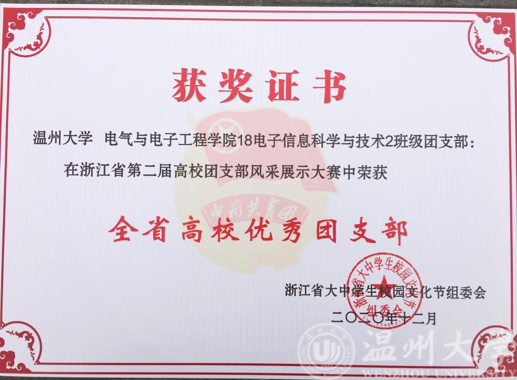 在刚刚结束的浙江省第二届高校团支部风采展示大赛中,欧美无码 18电科2班荣获“全省高校优秀团支部”荣誉称号。