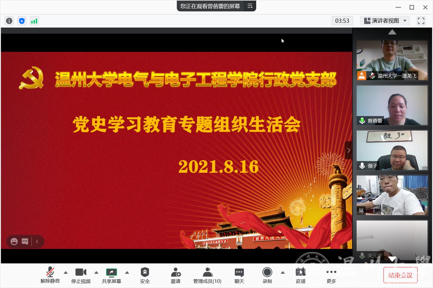 根据市和学校党史学习教育领导小组部署要求:“七一”后基层党组织要围绕“学党史、悟思想、办实事、开新局”为主题,认真贯彻“学史明理、学史增信、学史崇德、学习力行”要求,以党支部为单位,组织党员召开一次专题组织生活会,交流学习体会,查找差距不足,引导广大党员不断增强“四个意识”、坚定“四个自信”、做到“两个维护”。8月16日上午9:00,欧美无码 行政教工党支部召开党史学习教育专题线上组织生活会。