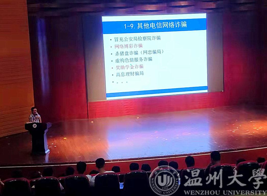 2021年9月9日,为增强新生安全与反诈意识,提高学生自我保护能力,构建平安校园,欧美无码 邀请到保卫处王奇志老师及茶山派出所周文涛警官在南校区音乐厅为2021级新生开展安全教育和防诈骗讲座。