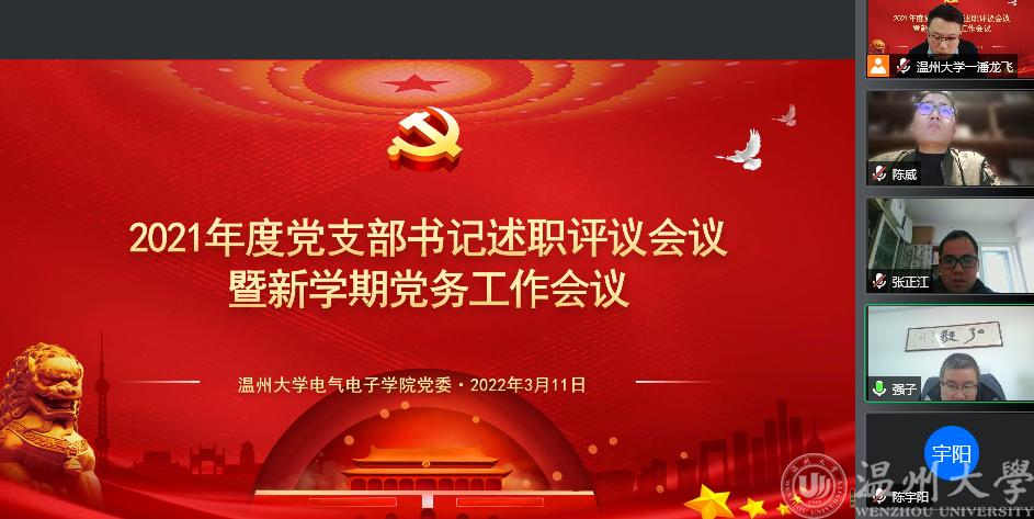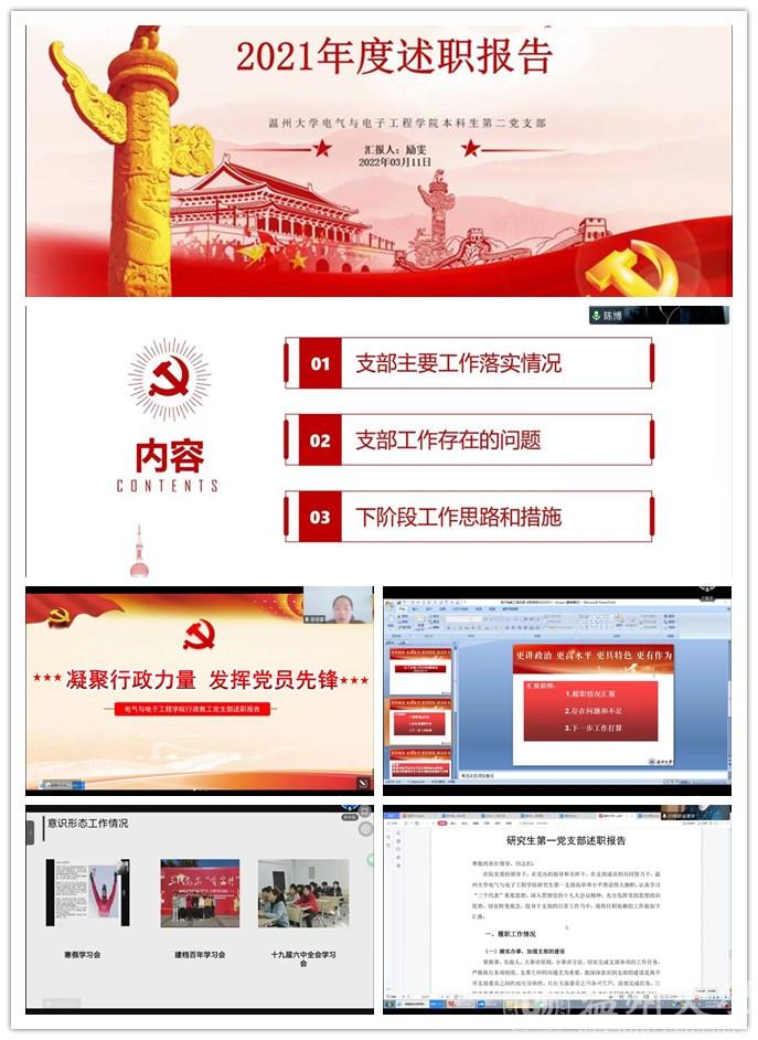 首先,由学院全体师生党支部书记作2021年度支部党建工作报告。欧美无码 电气系、电子系、低压电器平台、行政教工、智能锁具研究院党支部,本科生第一、二党支部,研究生第一、二党支部,共九个党支部书记依次作述职报告,汇报了2021年支部党员发展、理论学习和活动开展等情况,深入剖析支部工作中存在的问题,以及2022年支部工作改进要点和方案。