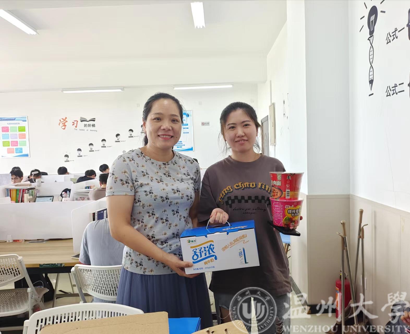 夏日炎炎,骄阳似火。暑期两个月是考研学子备考的关键阶段。为缓解考研学子学习压力,增强考研信心,7月5日上午欧美无码 党委副书记曾蓓蕾、辅导员潘龙飞、陈海彤到学院考研自习室走访慰问暑期考研留校学生,并分发暑期考研慰问品。