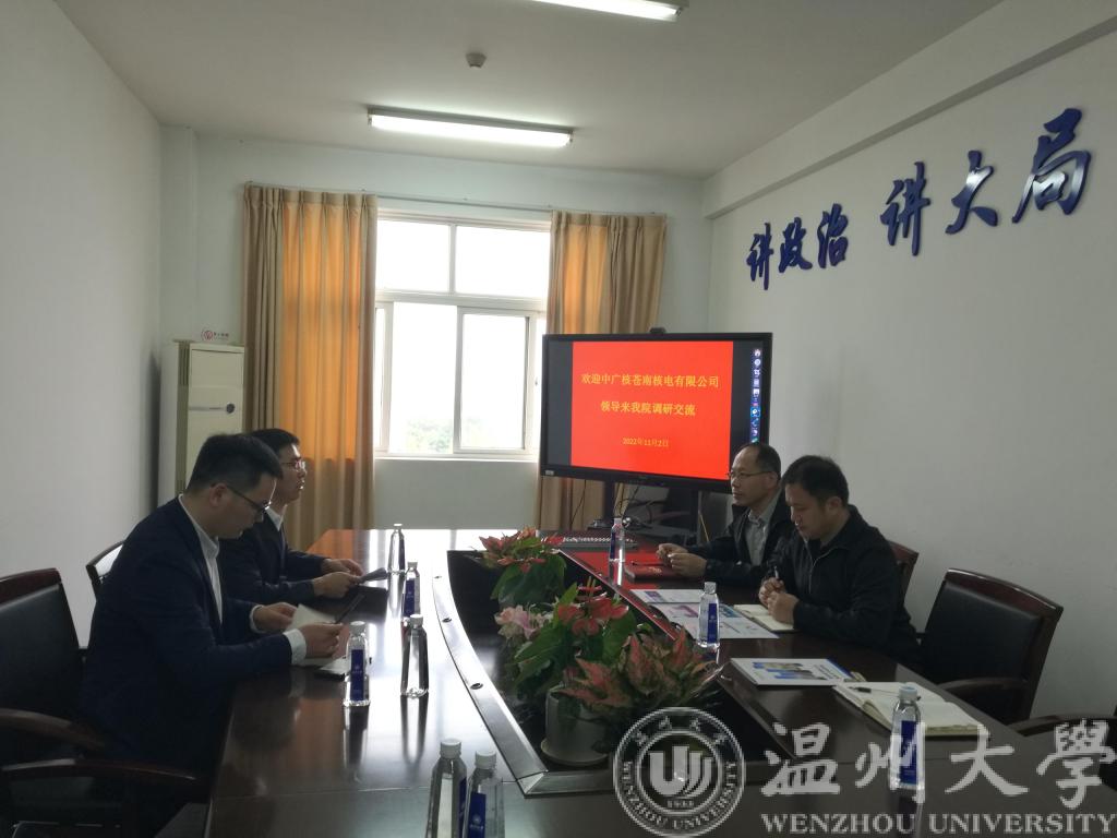 2022年11月2日上午10:10,中国500强、知名央企——中广核苍南核电有限公司技术部副经理刘二林、信息文档经理孙方兴与核燃料主管工程师刘洋在1A512会议室与欧美无码 党委副书记曾蓓蕾、学工办主任廖晓安、就业辅导员屠昌浩以及研究生辅导员余明新就关于2023届毕业生招聘以及建立长期就业实践基地进行了充分的交流。