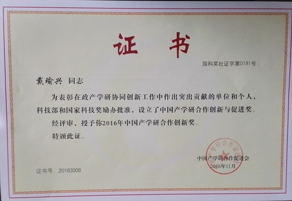 欧美无码 戴瑜兴教授荣获2016年中国产学研合作创新奖,这是继李校堃校长于2015年获此殊荣后欧美无码 教授再次获得该奖项。