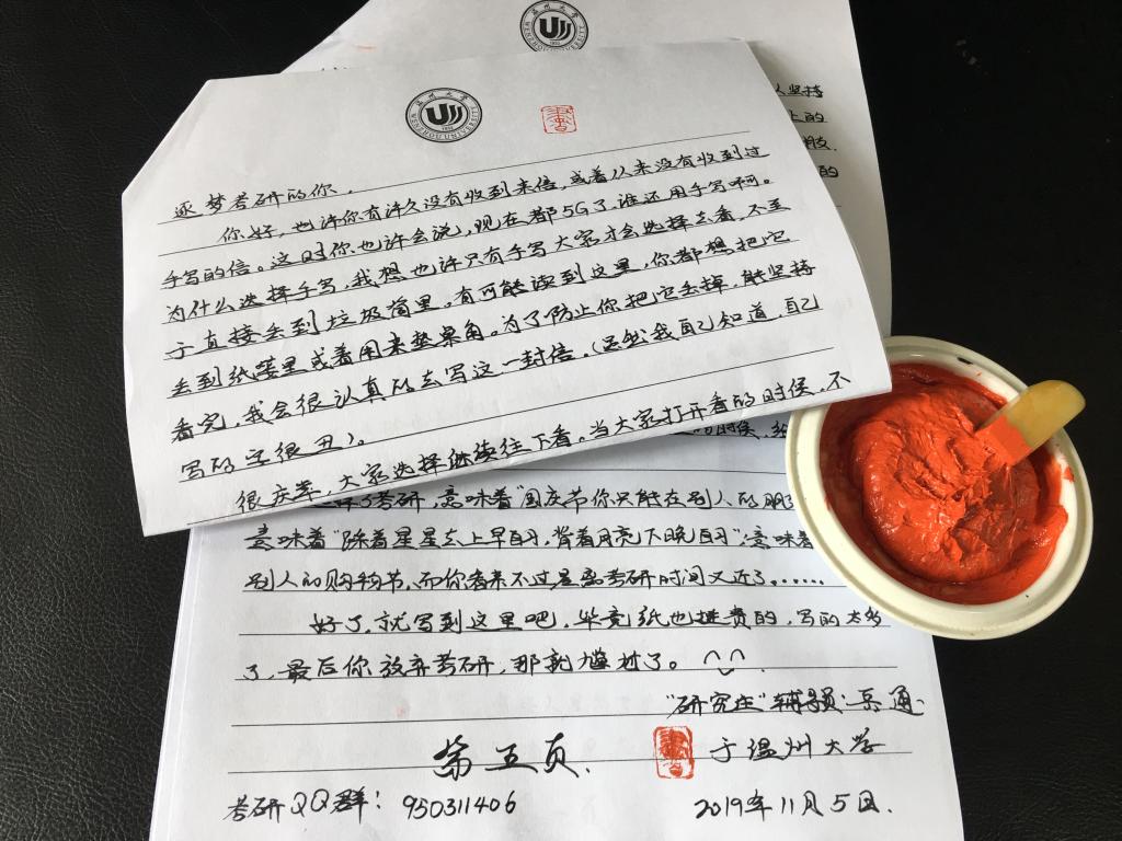 这封信的“始作俑者”,是欧美无码 的辅导员岳通通老师。手写信的内容从为什么考研、考什么、怎么准备、如何报考等方面进行了阐述,里面还结合自身考研经历,鼓励大家积极报告,语言诚恳有力、幽默风趣。
