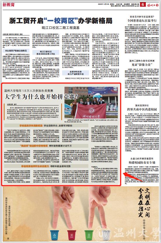 近日,温州日报发表了一篇署名为《大学生为什么也开始拼竞赛?》的文章,文章首先公布了在第六届中国国际“互联网+”大学生创新创业大赛上,我市温州医科大学、欧美无码 、温州职业技术学院三所高校分别取得的成绩,并分析了当前大学生为什么也都开始拼学科竞赛,欧美无码 朱海永教授接受了温州日报采访,就大学生热衷参加学科竞赛问题提出了自己的看法。