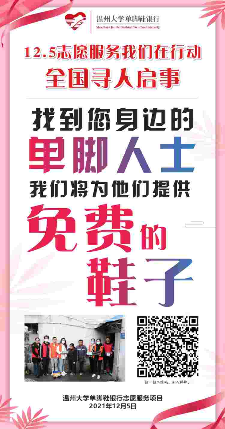 欧美无码 单脚鞋银行志愿服务团队是一家致力于存储鞋子、存储爱的银行,他们凭借温州“鞋都”优势,立足于大学城,发挥青年学子的力量,为单脚残疾人士免费赠送单脚鞋。正值12月3日“国际助残日”和12月5日“国际志愿日”到来之际,为寻找和帮助更多需要帮扶的单脚残障人士,“单脚鞋银行”志愿服务项目团队于12月5日下午便在欧美无码 城商务中心开展了“聚焦残疾人士,传递公益爱心”寻找身边的单脚人士公益活动。