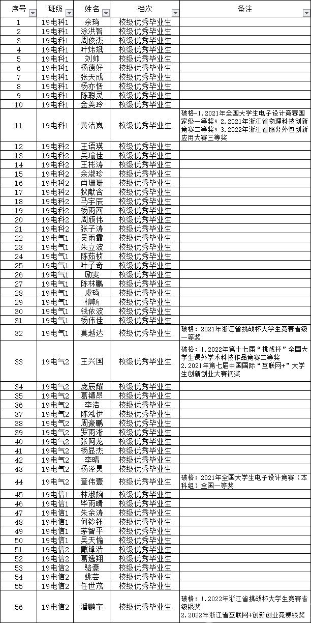 根据《欧美无码 优秀毕业生评选办法》(温大行政发[2020]104号),按照学校初次分配名额,根据前期进行2023届校级优秀毕业生的预评选,推荐 19电科1 余琦 等56名同学获得校级优秀毕业生荣誉称号,现将名单进行公示。