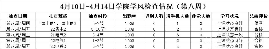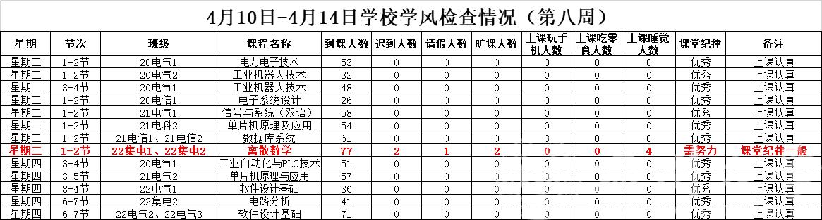 2023年4月10日至4月14日,学院学纪就业部对本院20个班次学生上课情况进行抽查。抽查情况反映如下: