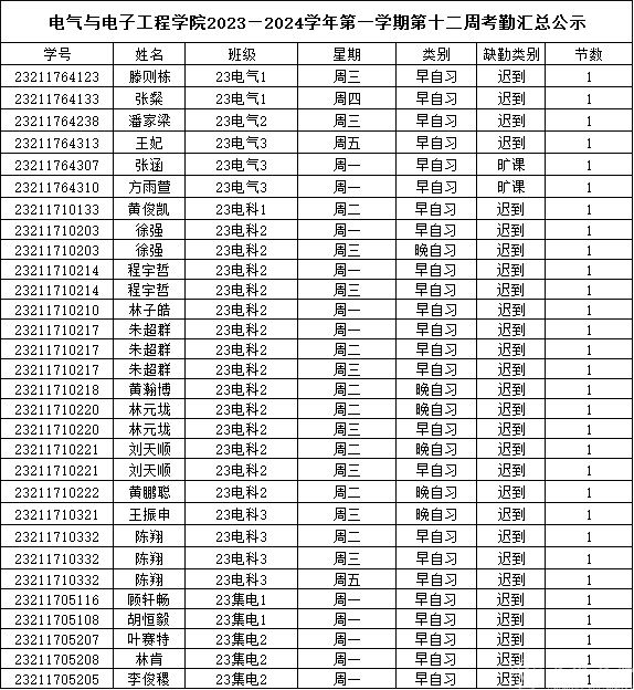 表1 2023.11.27-2023.12.3 十二周 学校学风检查情况