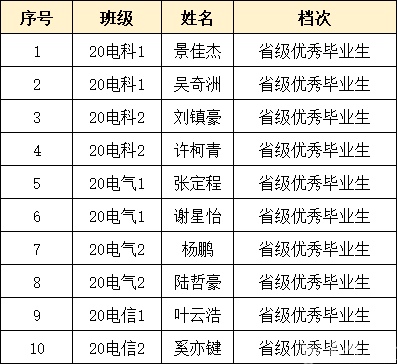 根据《欧美无码 优秀毕业生评选办法》(温大行政发[2020]104号),按照学校初次分配名额,根据前期进行2024届省级优秀毕业生的预评选,推荐 20电科1 景佳杰 等10名同学获得省级优秀毕业生荣誉称号,现将名单进行公示。