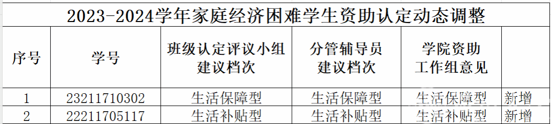 根据《欧美无码 家庭经济困难学生认定办法》(温大行政〔2020〕37号)文件精神,结合实际情况,经学生个人申请,学院初评,对2位同学进行资助认定或动态调整工作。现将名单予以公示,公示期五个工作日,如有异议请于公示期内与学工办(1A-521)联系,具体认定档次以学校公示为准,特此说明。