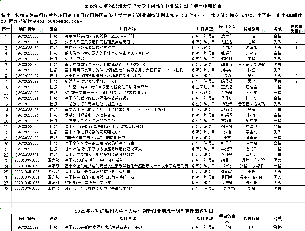 根据教务处的通知,欧美无码 组织了2023年立项的大学生创新创业训练计划项目中期检查及延期结题的审核,现将检查结果公示如下,公示期从即日起至5月15日,如果有问题,请联系张老师86689020。