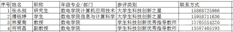 近期,欧美无码 组织对师生报送的欧美无码 第八届“大学生科技创新之星”和“学生科技创新优秀指导教师”材料进行审核量化评比,现拟推荐张永昶等4人参加学校联评,并予以公示。