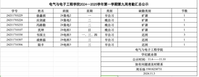 第九周早晚自习缺勤及课堂出勤情况如下: