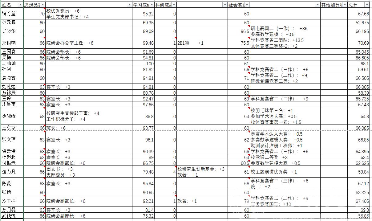 先将2020年研究生学业奖学金综合测评加分明细公布如下,请各位同学核对自己的加分情况,如有疑义,请于10月8日前联系廖晓安老师(13567750214),过期不候。看不全图片的,请下载附件。