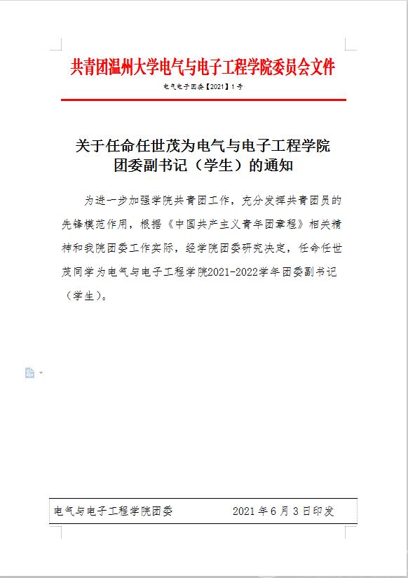 关于任命任世茂为欧美无码 团委副书记(学生)的通知
