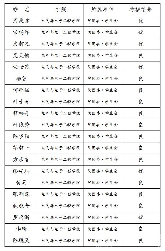 依据校团委《关于2020-2021学年第二学期学生干部学期工作考核的通知》,经学院考核小组民主评议,对学生干部的德、能、勤、绩等四方面进行全面考评,现将学院2020——2021学年第二学期学生干部考核结果公示如下: