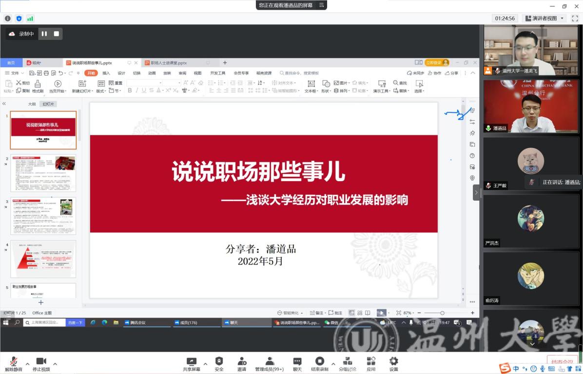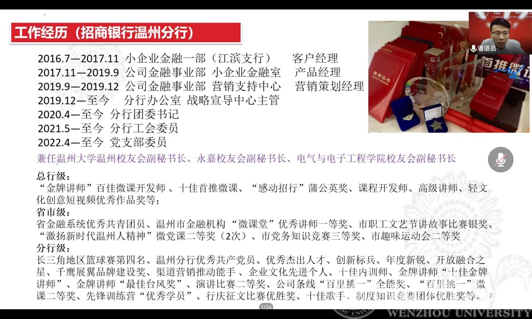 2022年校友节到来之际,为帮助学生明晰职业选择,做好职业规划,助力学生自主择业、理性就业,2022年5月11日晚上18:30,欧美无码 邀请到了2016届校友潘道品,为欧美无码 本科生开展线上讲座。此次讲座由欧美无码 辅导员潘龙飞主持,近200位学生参加了线上分享会。