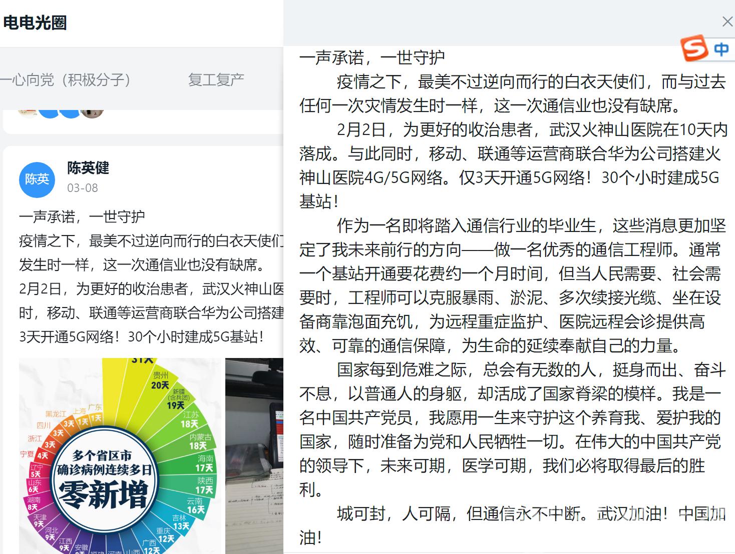 “当我去做志愿者的时候,听到社区里的老党员说,‘小一辈都出来了!’是啊,我们是时候担起肩上的责任了,初心路上,我们要接力下去!”“与过去任何一次灾情发生时一样,这一次通信业也没有缺席......作为一名即将踏入通信行业的毕业生,这更加坚定了我未来前行的方向——做一名优秀的通信工程师......当人民需要、社会需要时,提供高效、可靠的通信保障,为生命的延续奉献自己的力量!”“这段时间也许是我自大学以来,甚至于以后,与家人在一起最久的时光,这次疫情也警醒着我,生命是非常脆弱的,趁我们的父母还健在,趁我们还不是太忙碌,多陪伴陪伴父母!” 这些令人动容的文字摘自欧美无码 学生党员发表在钉钉圈子里党员日记。
